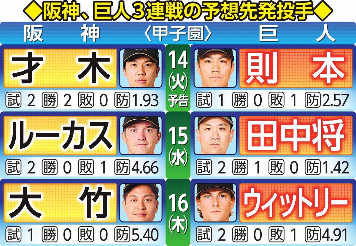 【阪神先発】巨人戦3連戦、則本・田中将攻略へ 大竹ローテ復帰